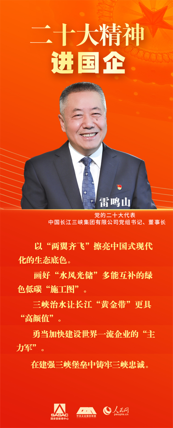 “在新时代新征程上,中国三峡集团将牢记习近平总书记‘社会主义是干出来的、新时代是奋斗出来的’殷殷嘱托,以党的二十大精神为指引,奋进‘两翼齐飞’,发挥‘六大作用’,加快建设世界一流企业,在促进人与自然和谐共生中发挥更大作用、作出更大贡献。”雷鸣山说。