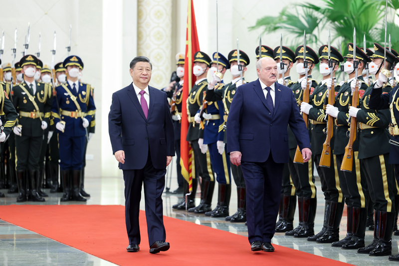 3月1日,国家主席习近平在北京人民大会堂同来华进行国事访问的白俄罗斯总统卢卡申科举行会谈。这是会谈前,习近平在人民大会堂北大厅为卢卡申科举行欢迎仪式。新华社记者 刘彬 摄