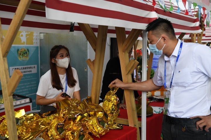 观众在东博会国际水果创意生活展区挑选榴莲(9月18日摄)。新华社记者 周华 摄