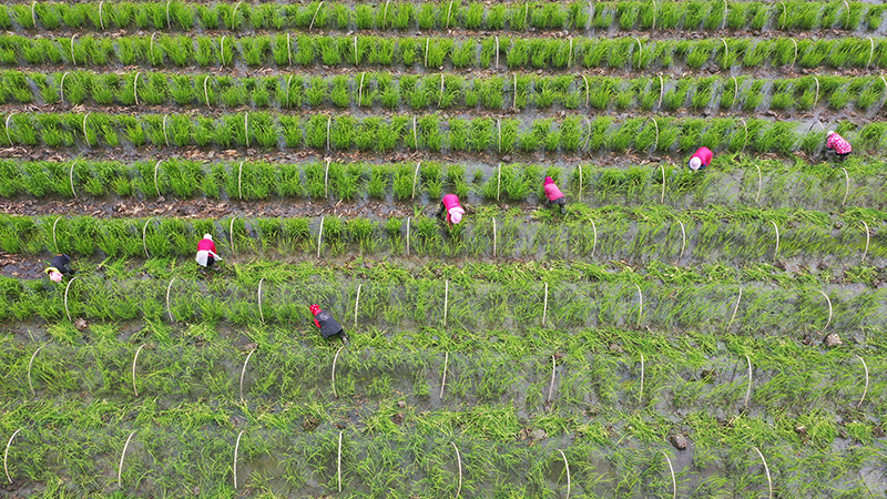 2023年2月23日,浙江省温岭市新河镇农民进行茭白秧苗春季管理(无人机照片)。新华社发(周学军 摄)