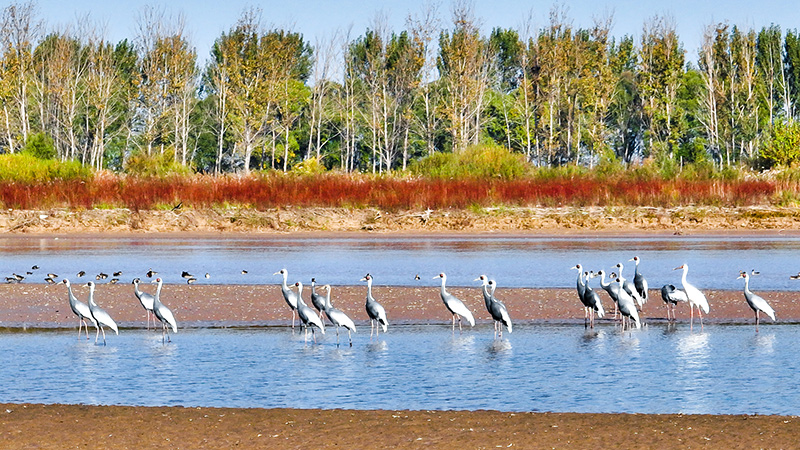 在山东黄河三角洲国家级自然保护区拍摄的白枕鹤(2022年10月18日摄)。新华社发(杨斌 摄)