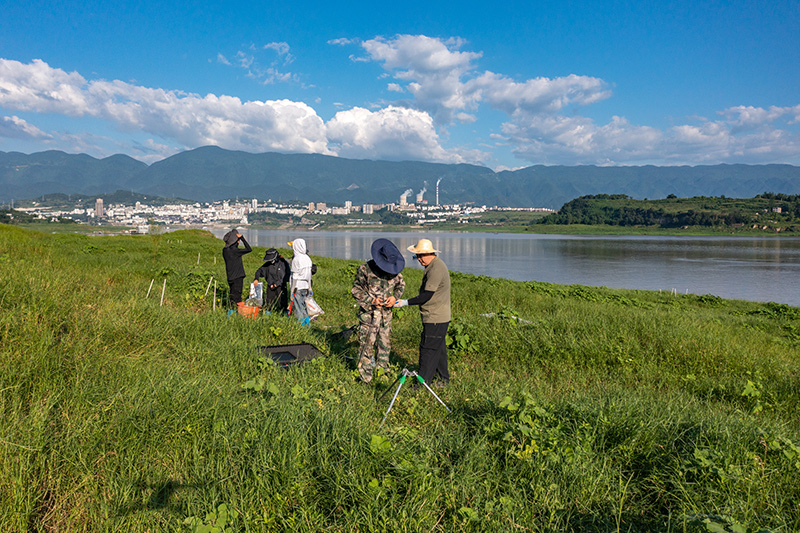 在位于重庆的中国科学院三峡库区水土保持与环境研究站,中国科学院成都山地所科研人员在库区消落带上开展相关监测(2023年7月5日摄,无人机照片)。新华社记者 黄伟 摄