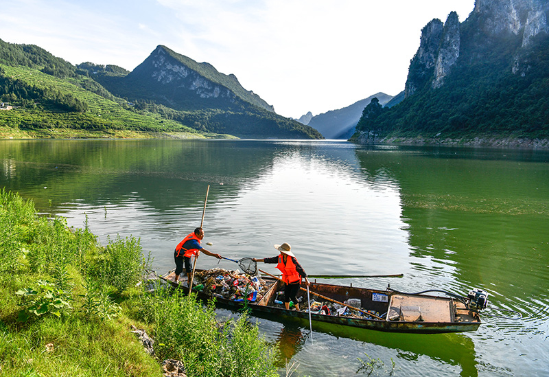 贵州省瓮安县珠藏镇丰岩村村民卢锡永、冉茂英夫妇驾驶小船在乌江上打捞漂浮物(2023年7月10日摄)。新华社记者 杨文斌 摄