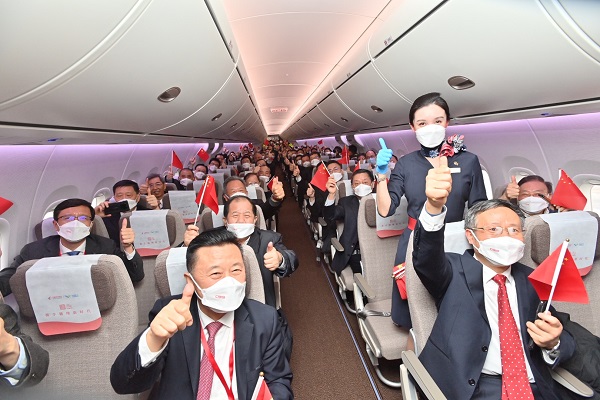 参加交付航班的旅客在客舱中挥舞国旗