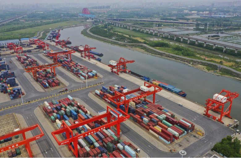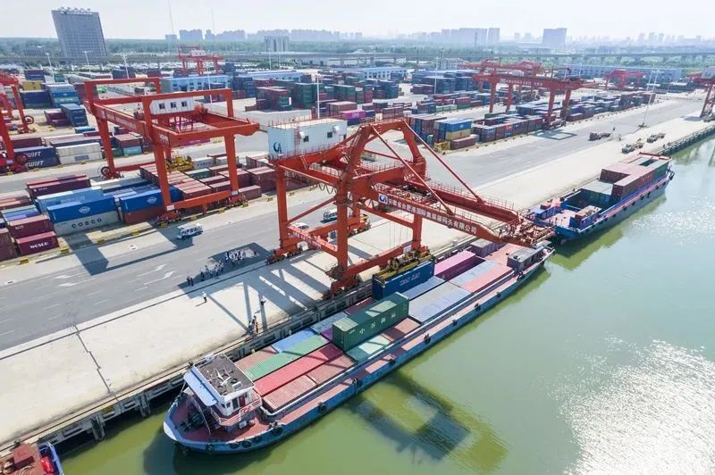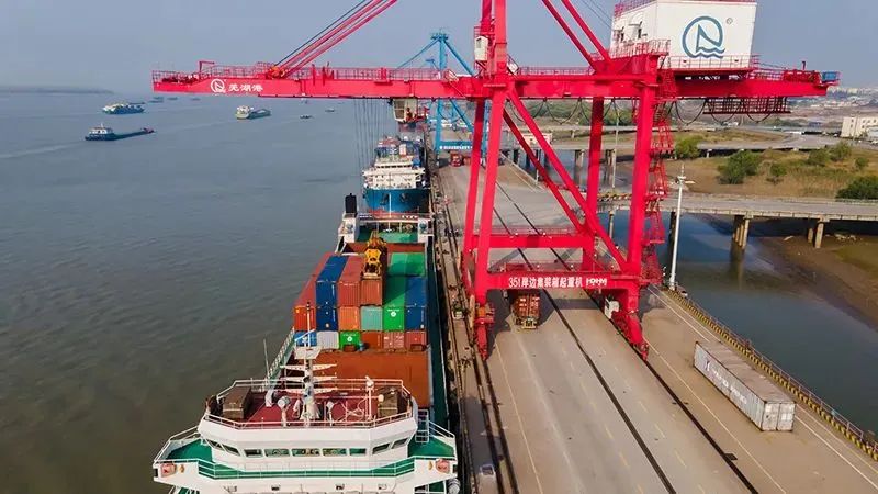 在芜湖港朱家桥码头,无人场桥高高耸立,装卸繁忙,一排排整齐码放的集装箱堆满货场。