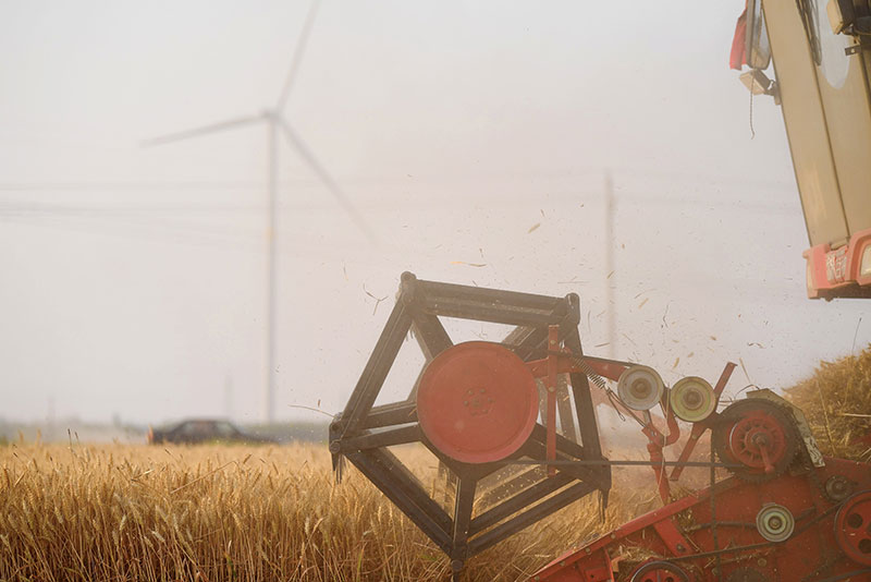 在河南省安阳市汤阴县菜园镇高标准农田示范区,收割机在麦田作业(2022年6月8日摄)。新华社记者 郝源 摄