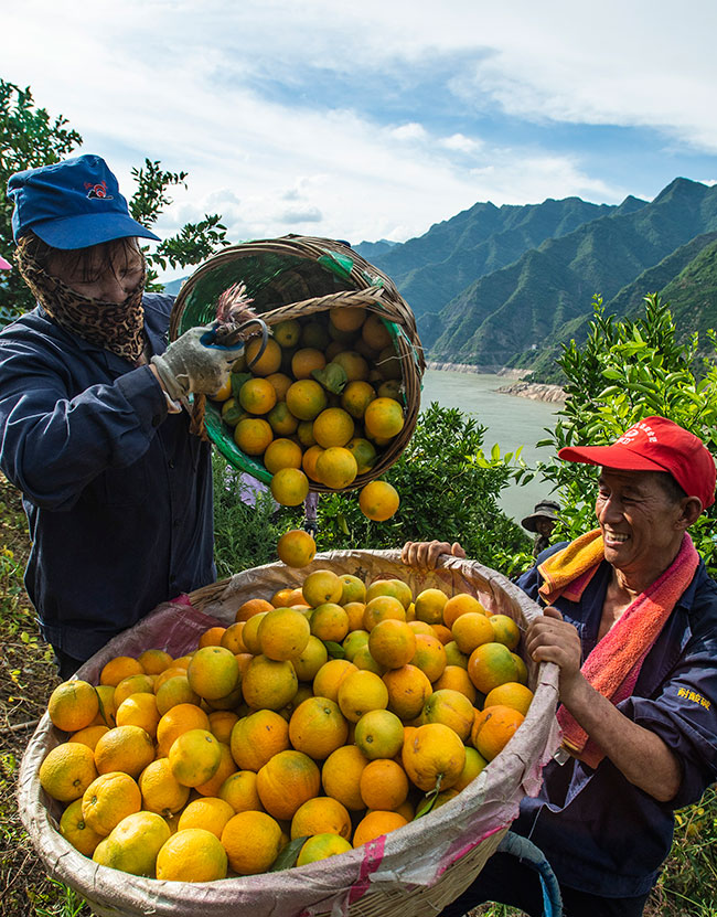 湖北省宜昌市秭归县沙镇溪镇台子湾村村民在柑橘园里转运夏橙(2022年6月21日摄)。新华社发(郑家裕 摄)