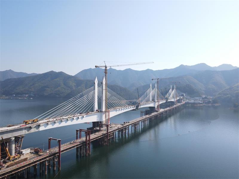 作为池黄高铁全线唯一的控制性工程,太平湖特大桥全长926.1米,其中主桥长788米,采用多塔矮塔斜拉桥结构形式;两个主跨长度均达到228米,为目前我国高速铁路多塔矮塔斜拉桥中最大跨度。