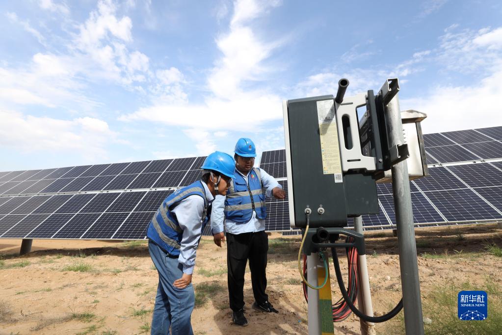 国家电投五凌电力余丁光伏电站职工在检修设备(2022年8月31日摄)。