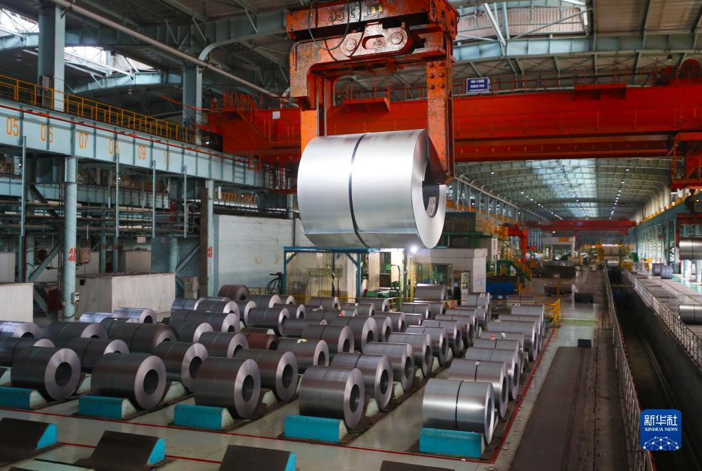 在本钢冷轧厂,吊车在吊装钢卷(2021年8月18日摄)。