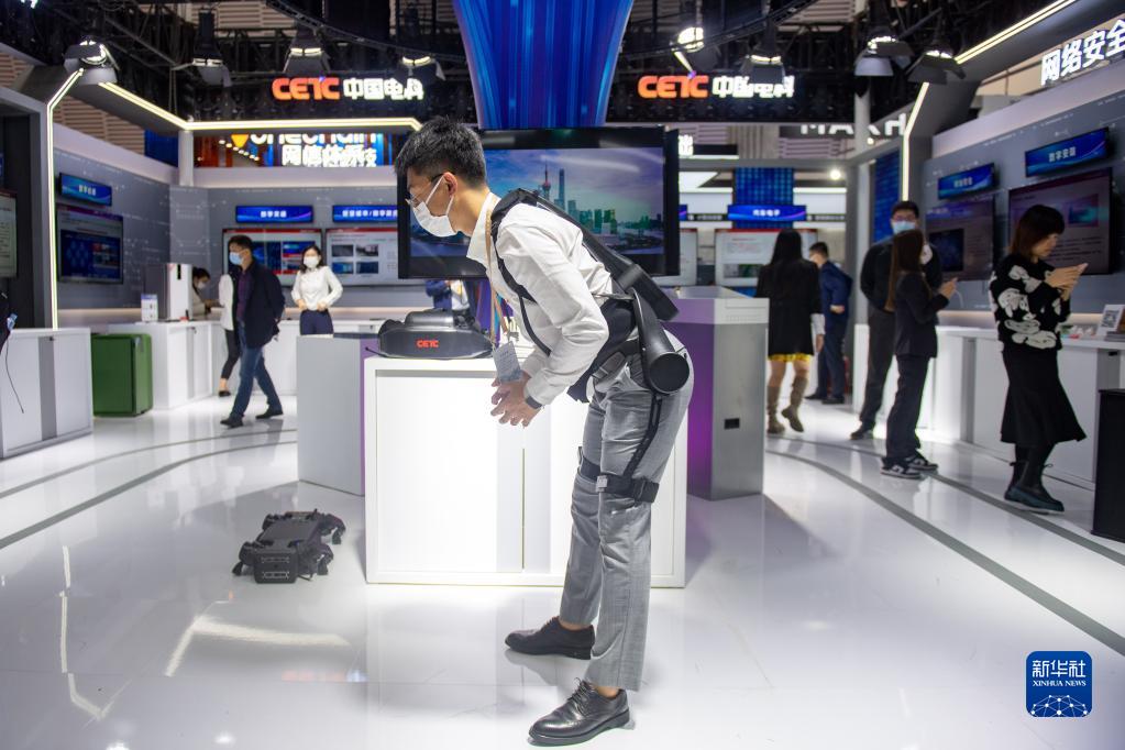 在浙江乌镇举办的2022年“互联网之光”博览会上,中国电科工作人员为观众演示外骨骼机器人的使用(2022年11月8日摄)。