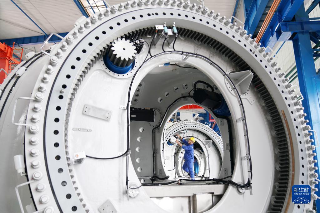 在黑龙江省齐齐哈尔市中国一重集团有限公司风电装备生产制造厂生产车间,工人进行生产作业(2021年7月1日摄)。